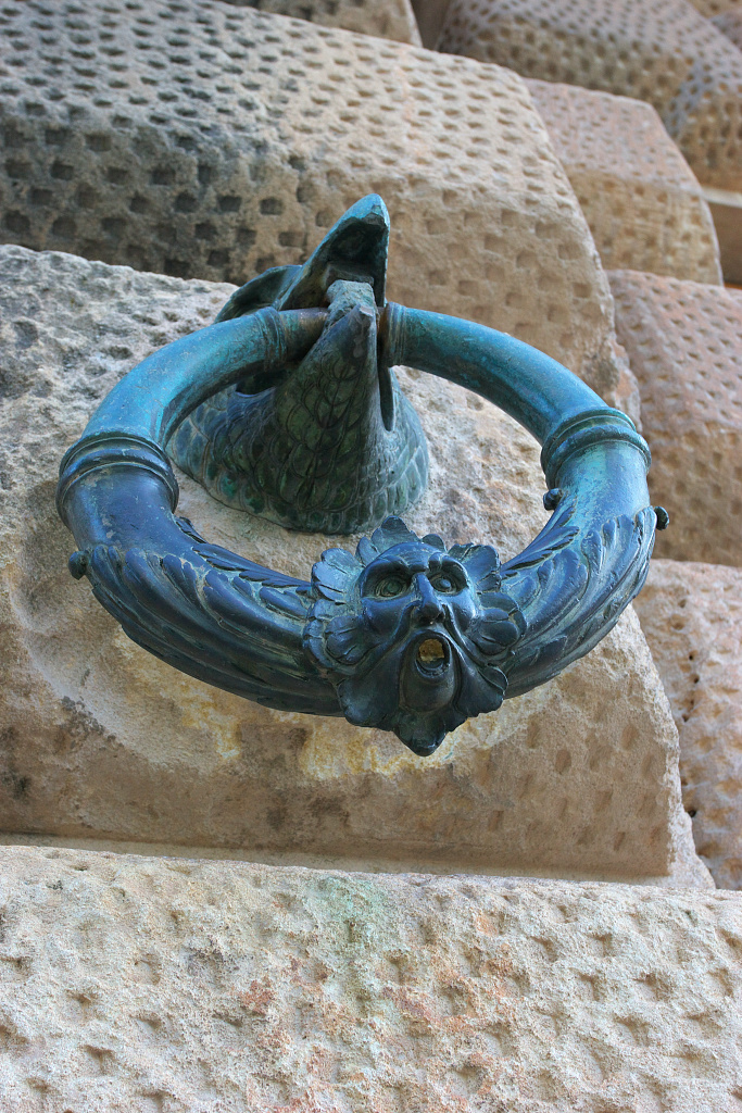 取っ手のような金属のリングに顔がついています。こういう装飾はヨーロッパに多いですね。