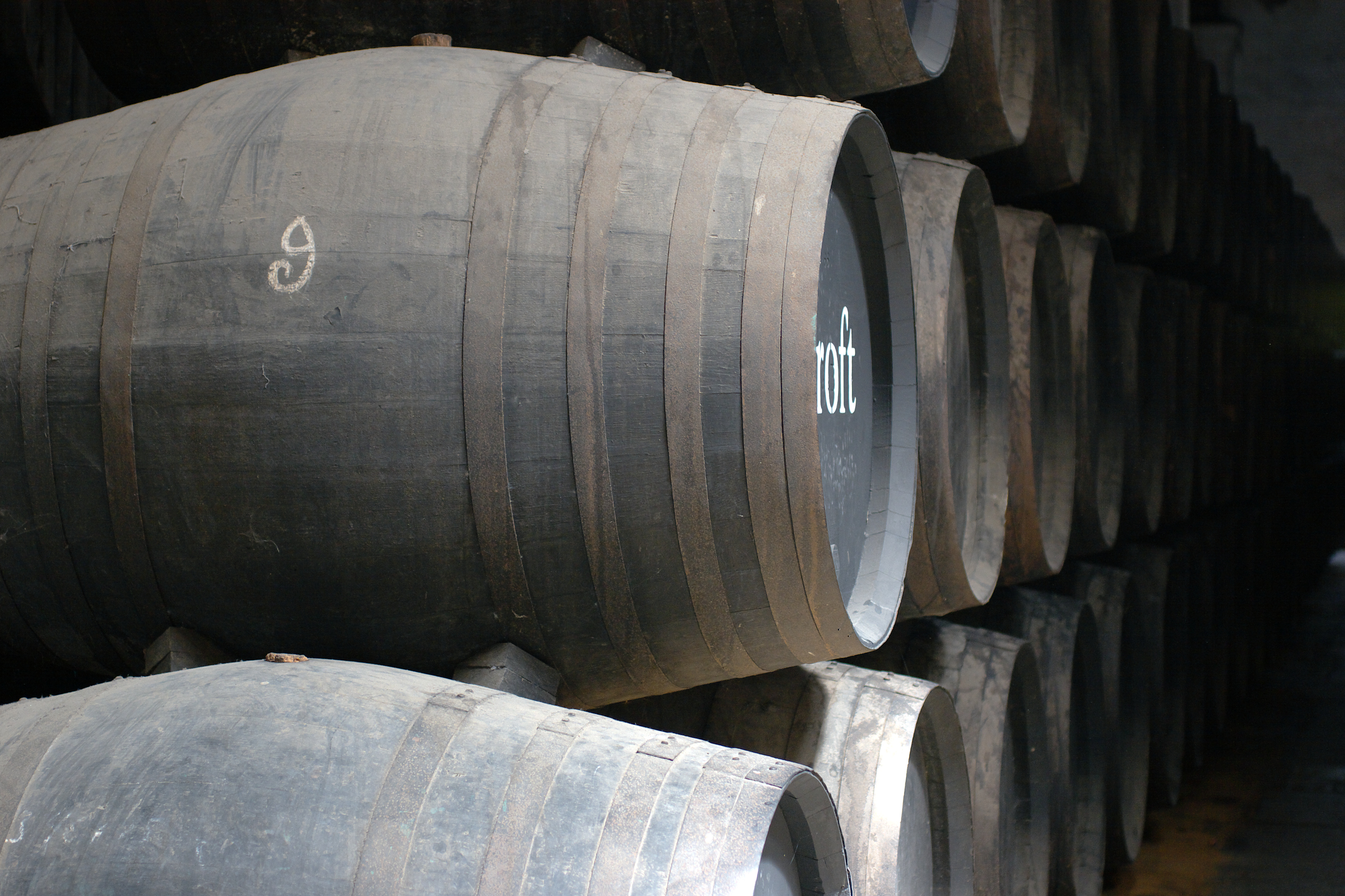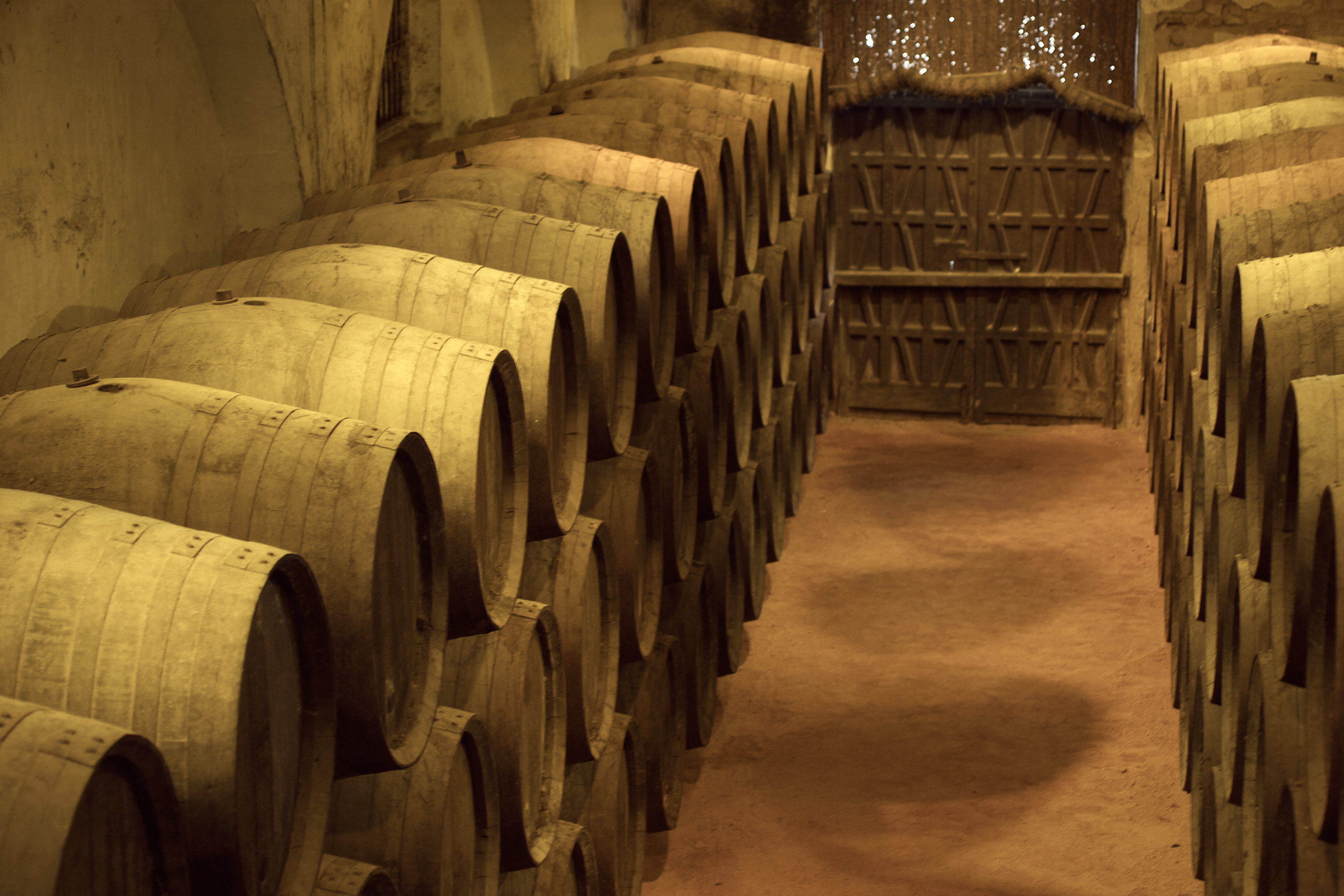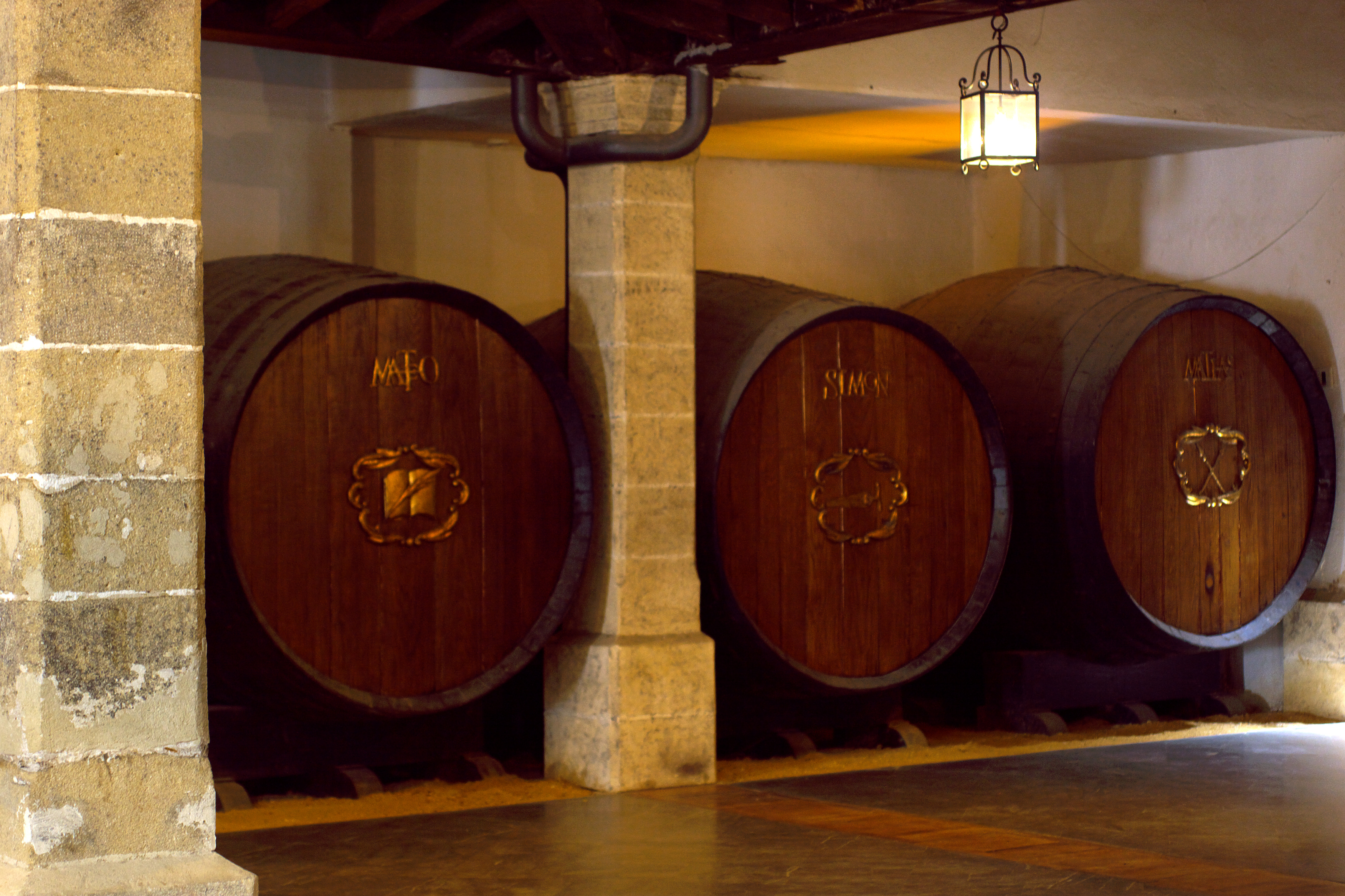 倉に積んであるシェリー酒の樽です。中には甘口のシェリー酒が入っています。