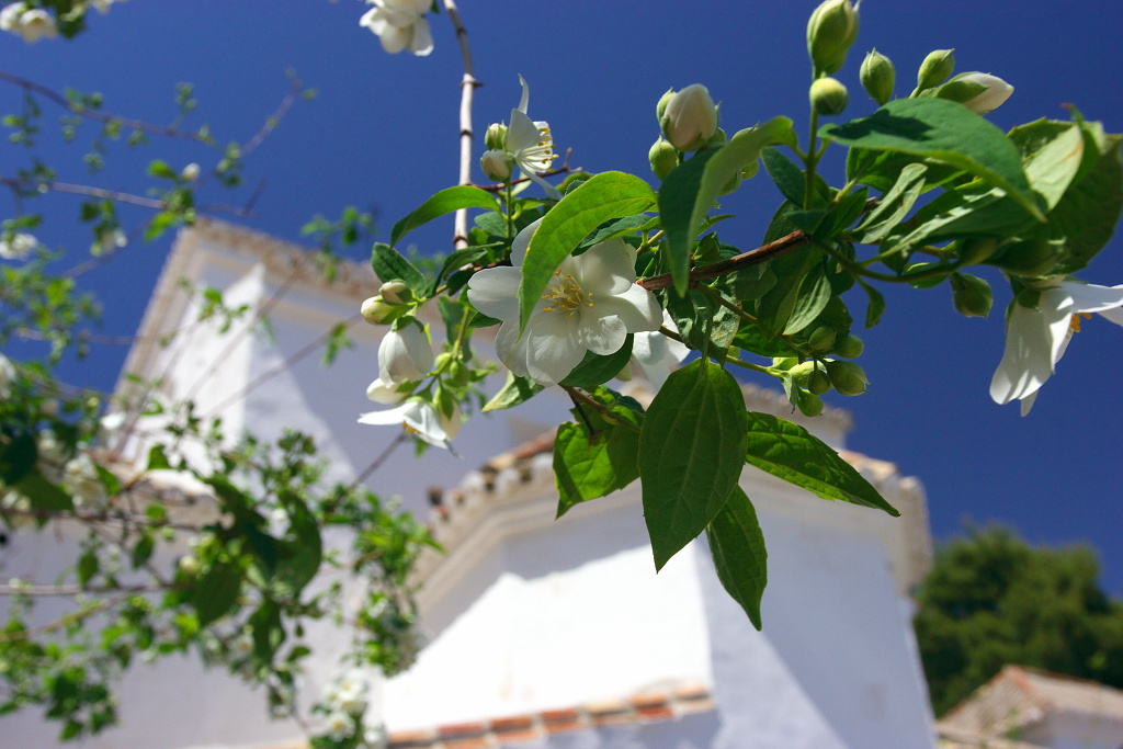 白い花が木に咲いています。その向こうに白い壁の家。青い空を背景にどちらも映えます。
