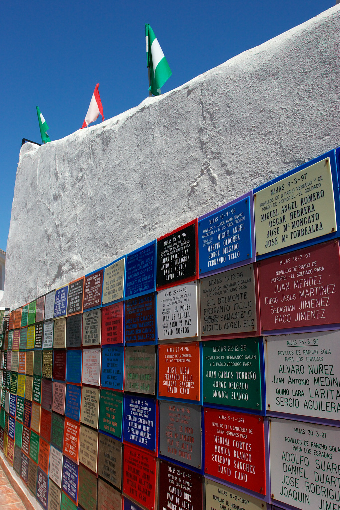 闘牛場で戦った歴戦の記録です。カラフルに飾られています。