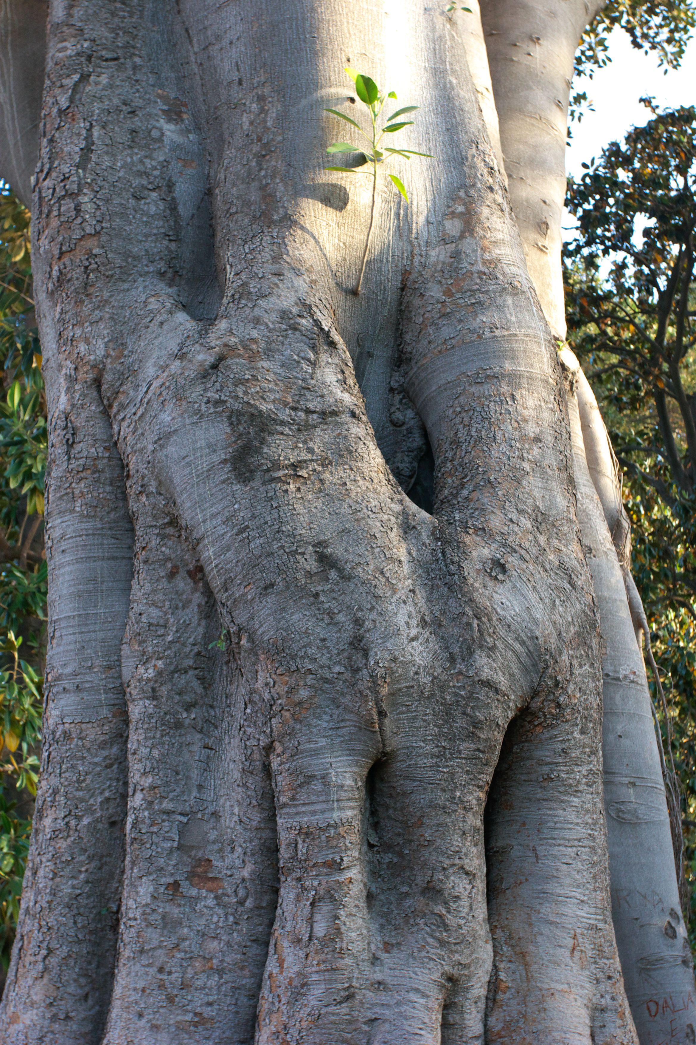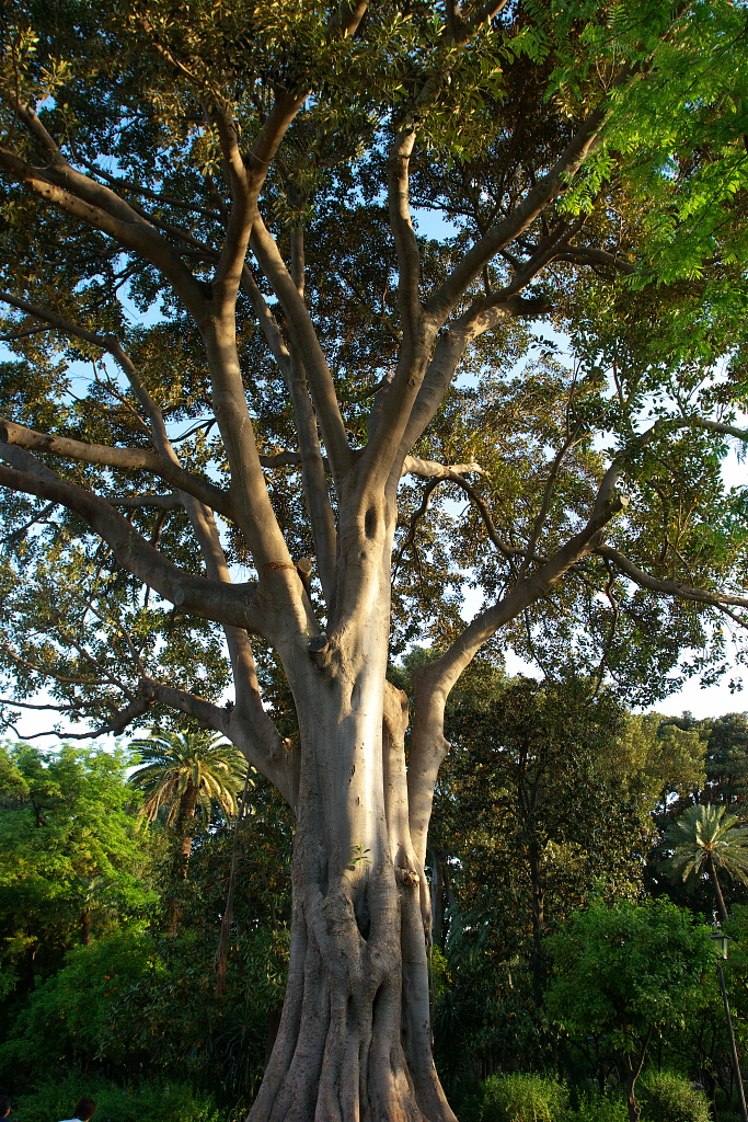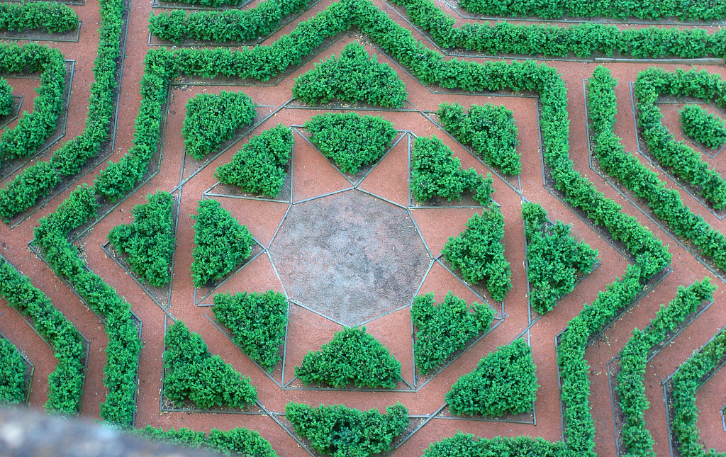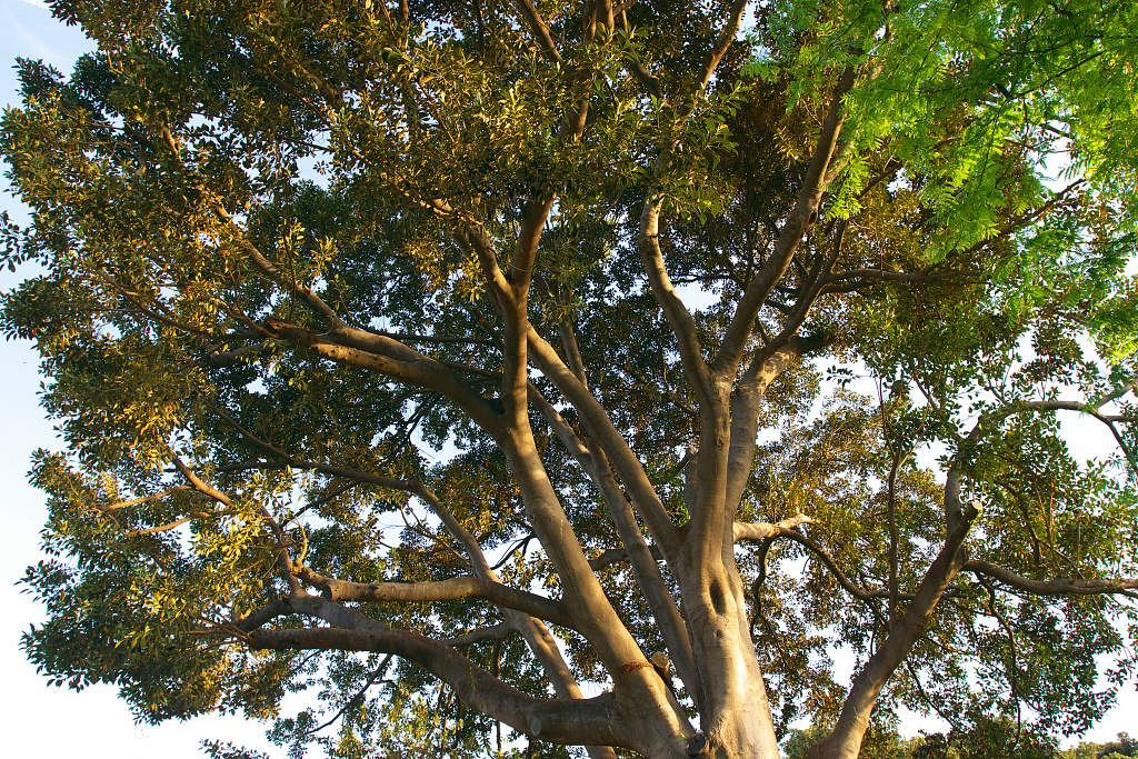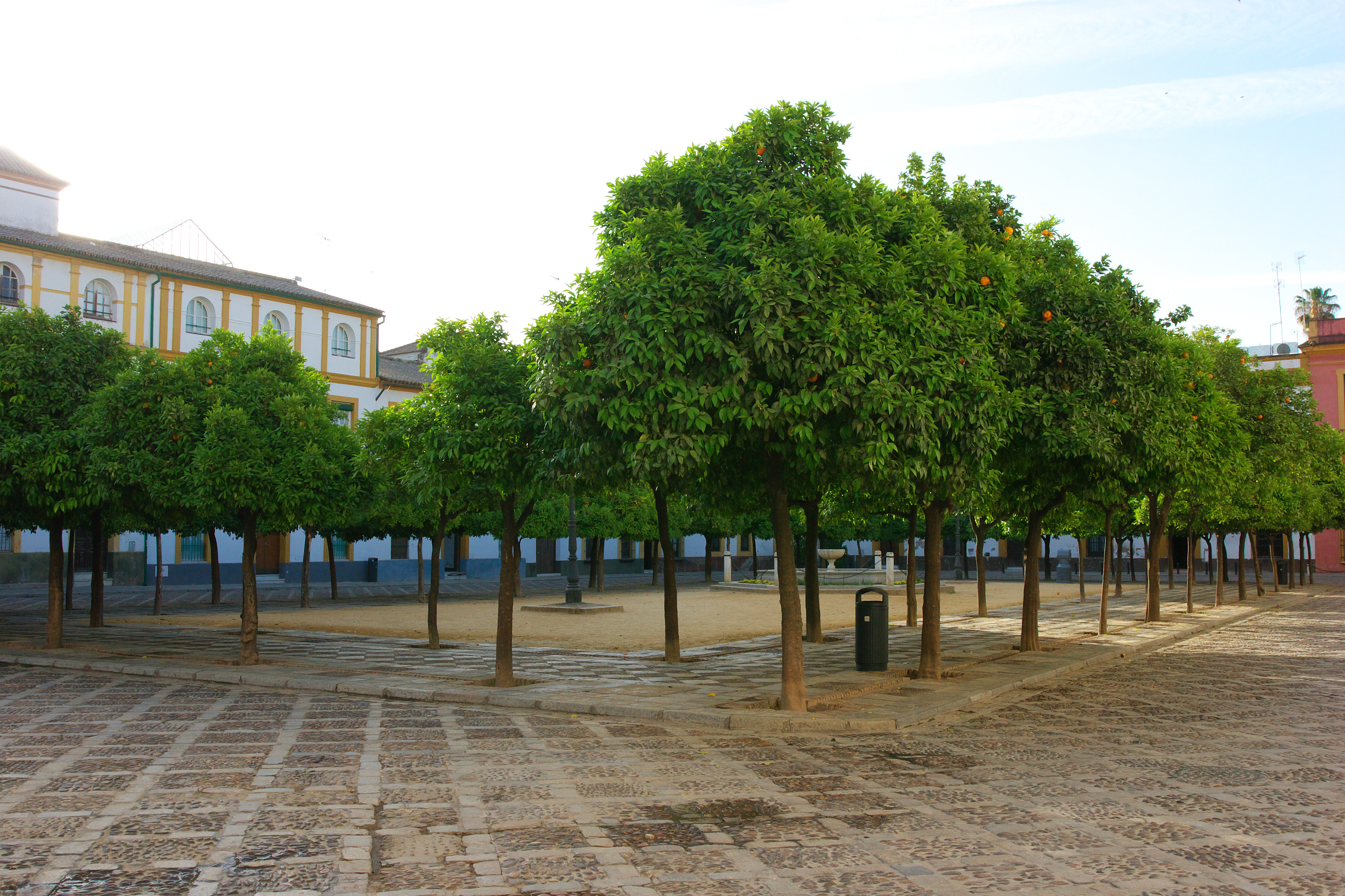 木で囲まれた小さな公園。木にはオレンジがなっているようですね。