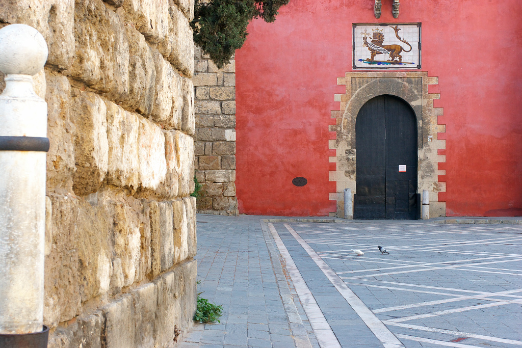 ライオンの意匠がついた赤い壁が印象的な風景。