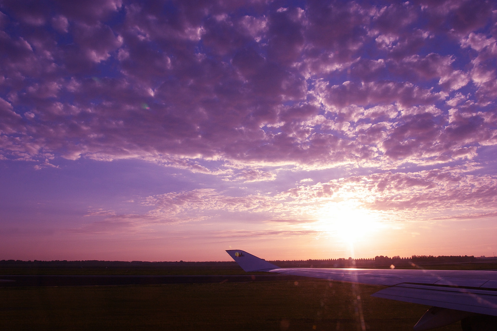 落ちていく夕日と羊雲を飛行機の中から撮影しました。