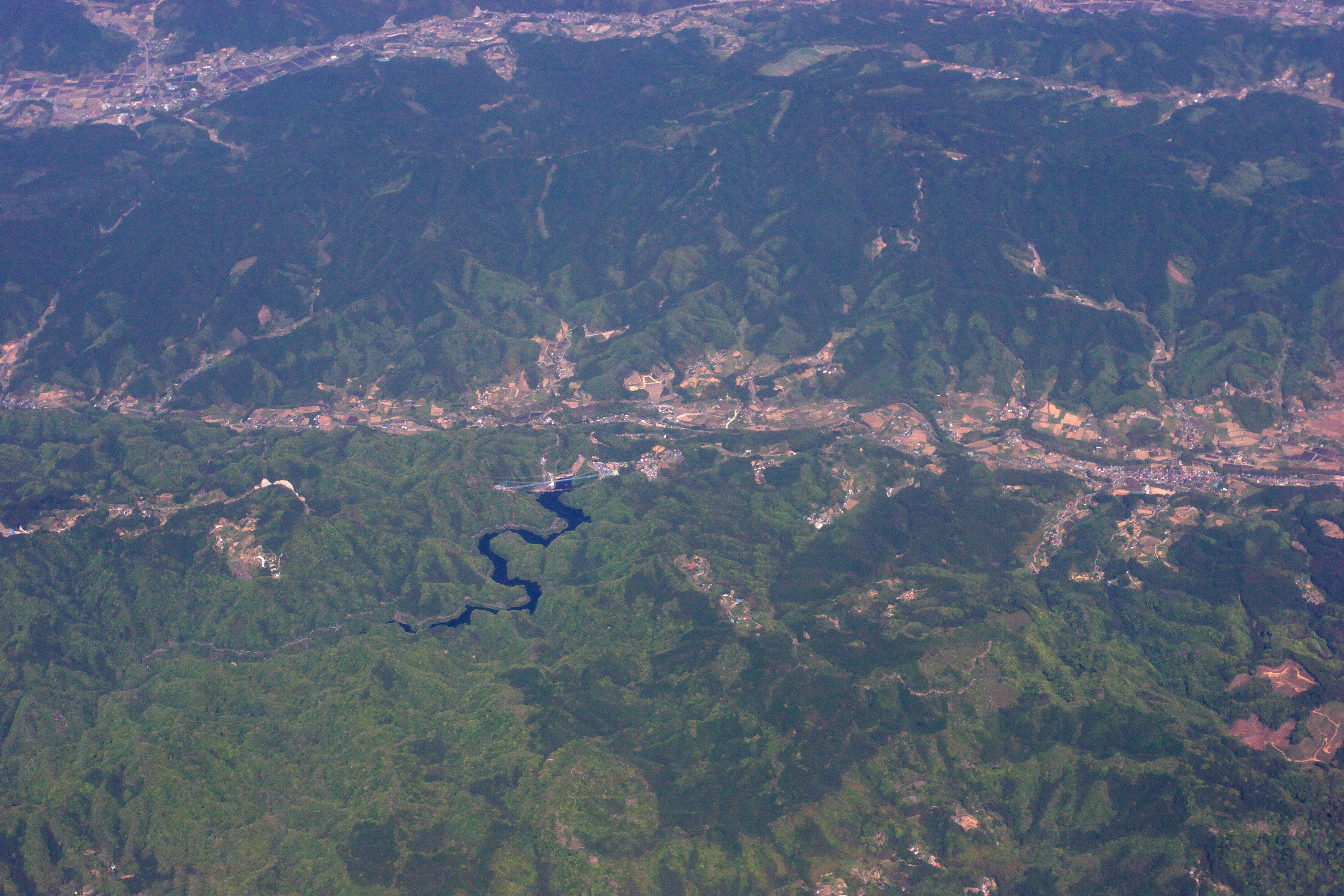 川がダムによってせき止められているのがよくわかります。吊り橋が架かっているみたいですね。