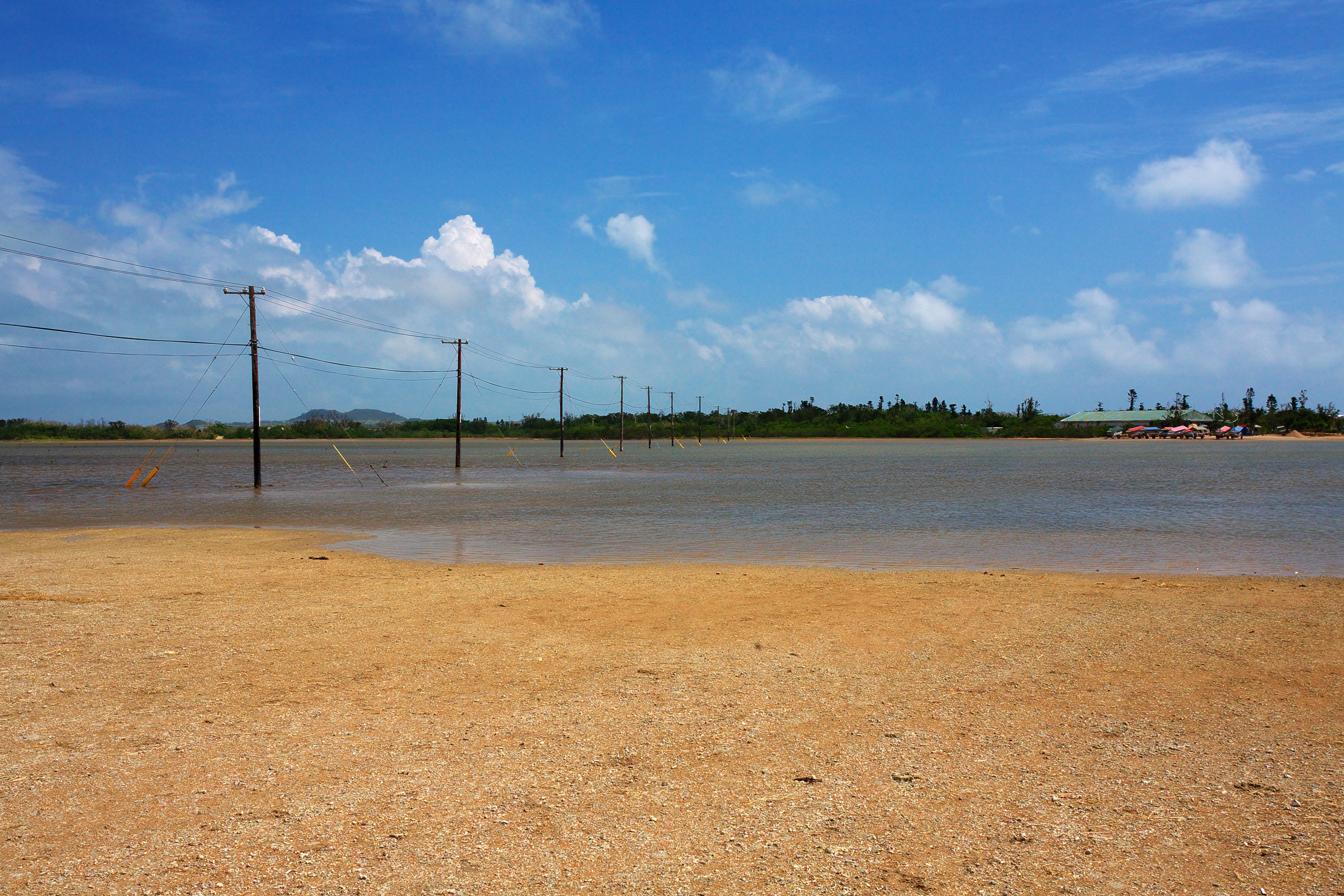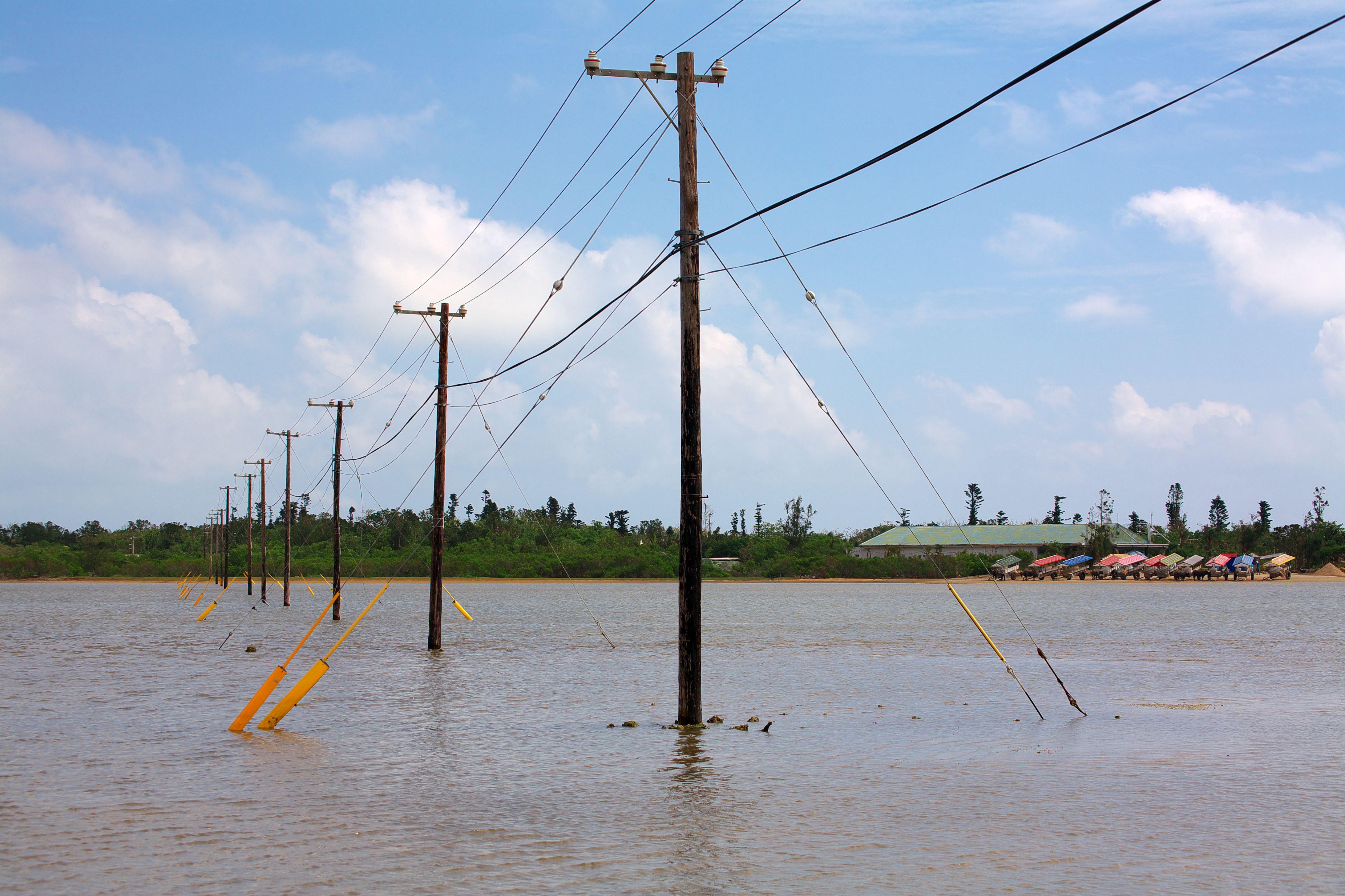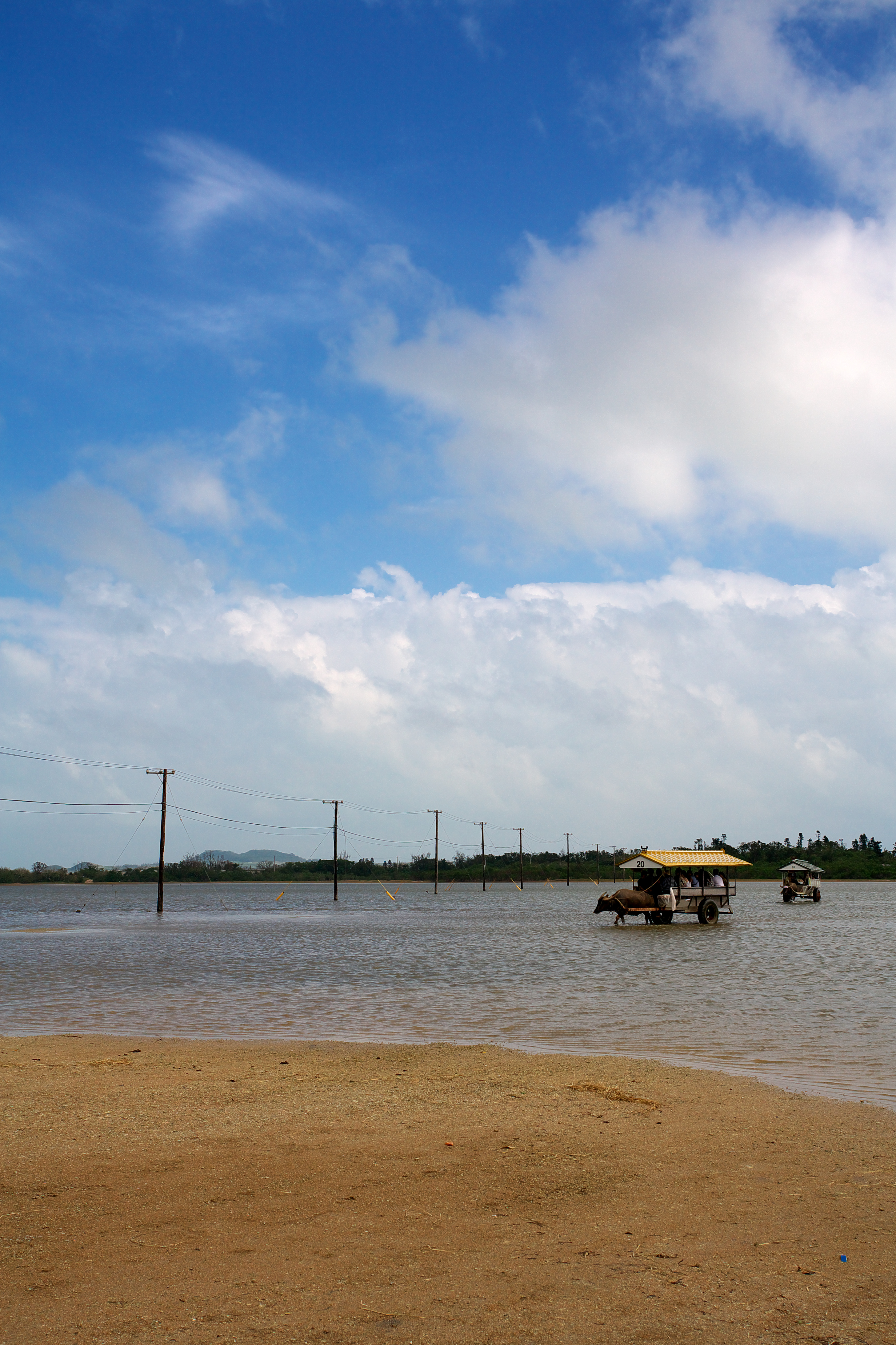立ち並ぶ電柱と由布島の海岸に並んでいる牛車です。この写真のように向側に牛車がすべて行ってしまっているときは島に渡る手段はありません。