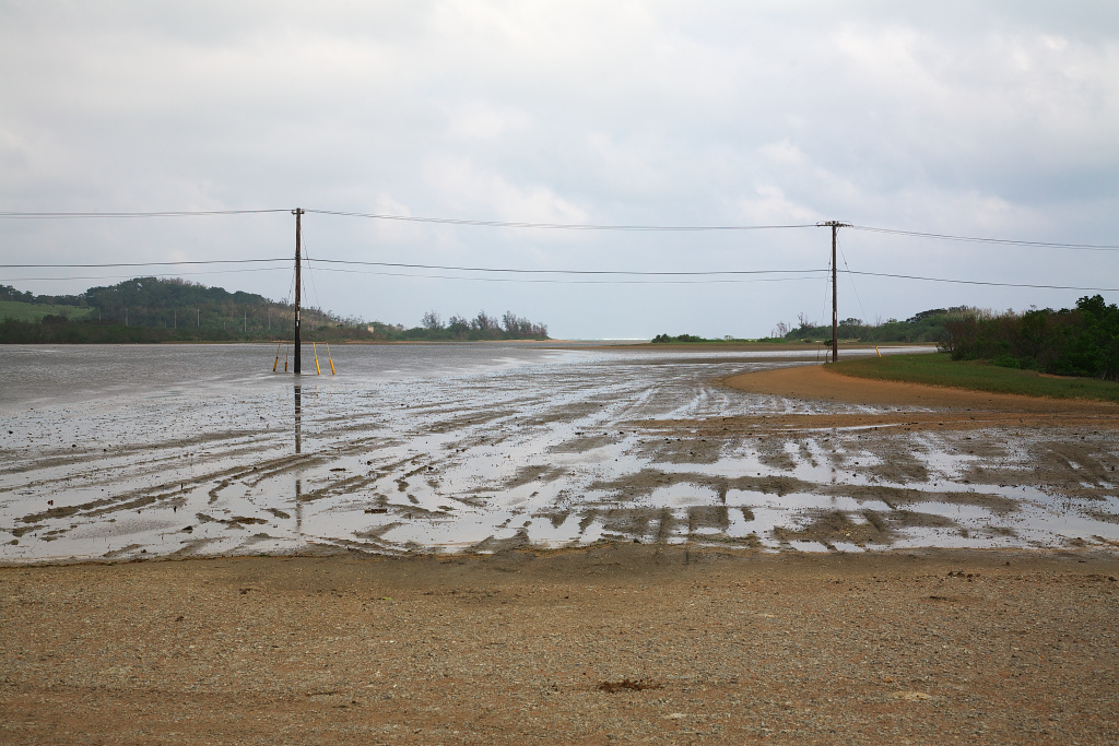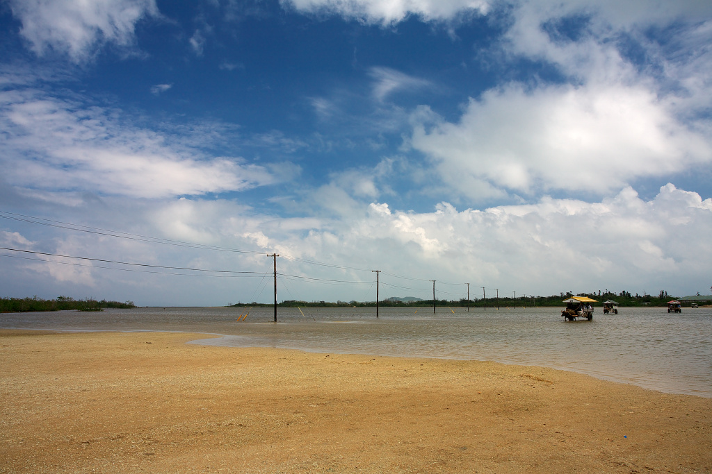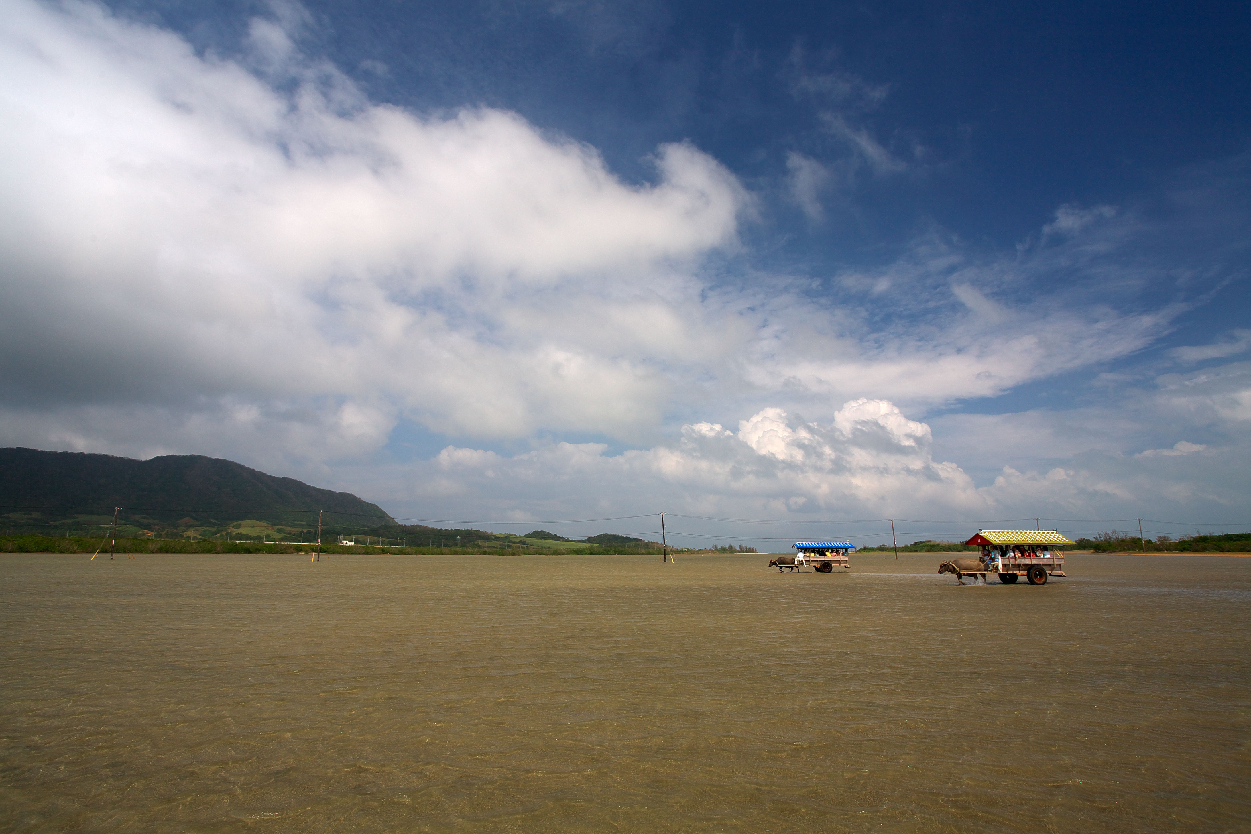 向こうに見える島が由布島です。ここは島への唯一の道ですが、潮が満ちていて牛車でしか通行できません。