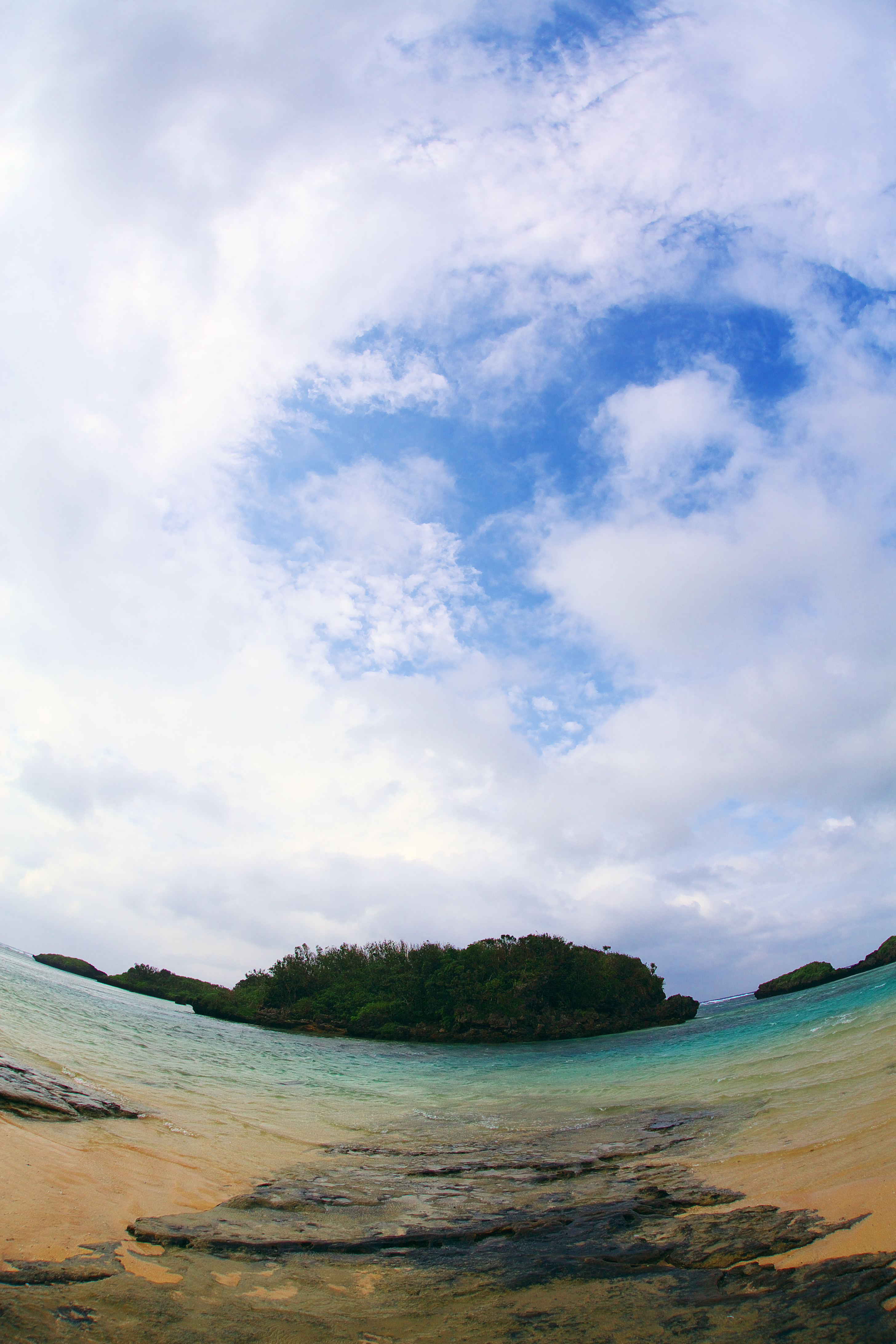 夏の雲と青い空、浅瀬の海。海水浴に行きたくなります。