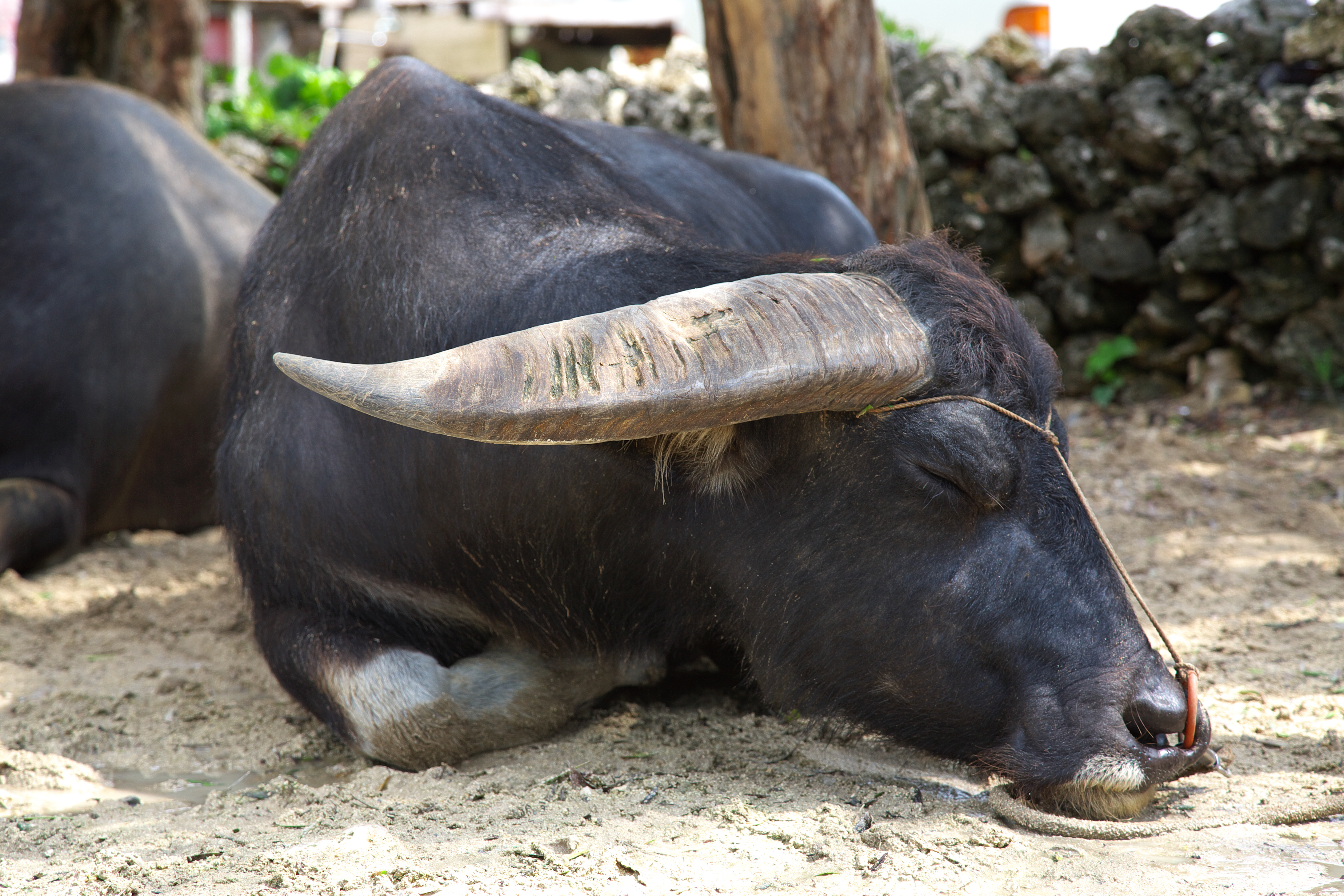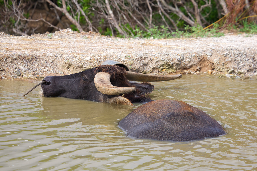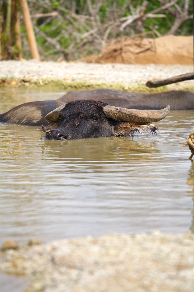 休憩中の水牛さん。暑いので水風呂につかって気持ちよさそうです。