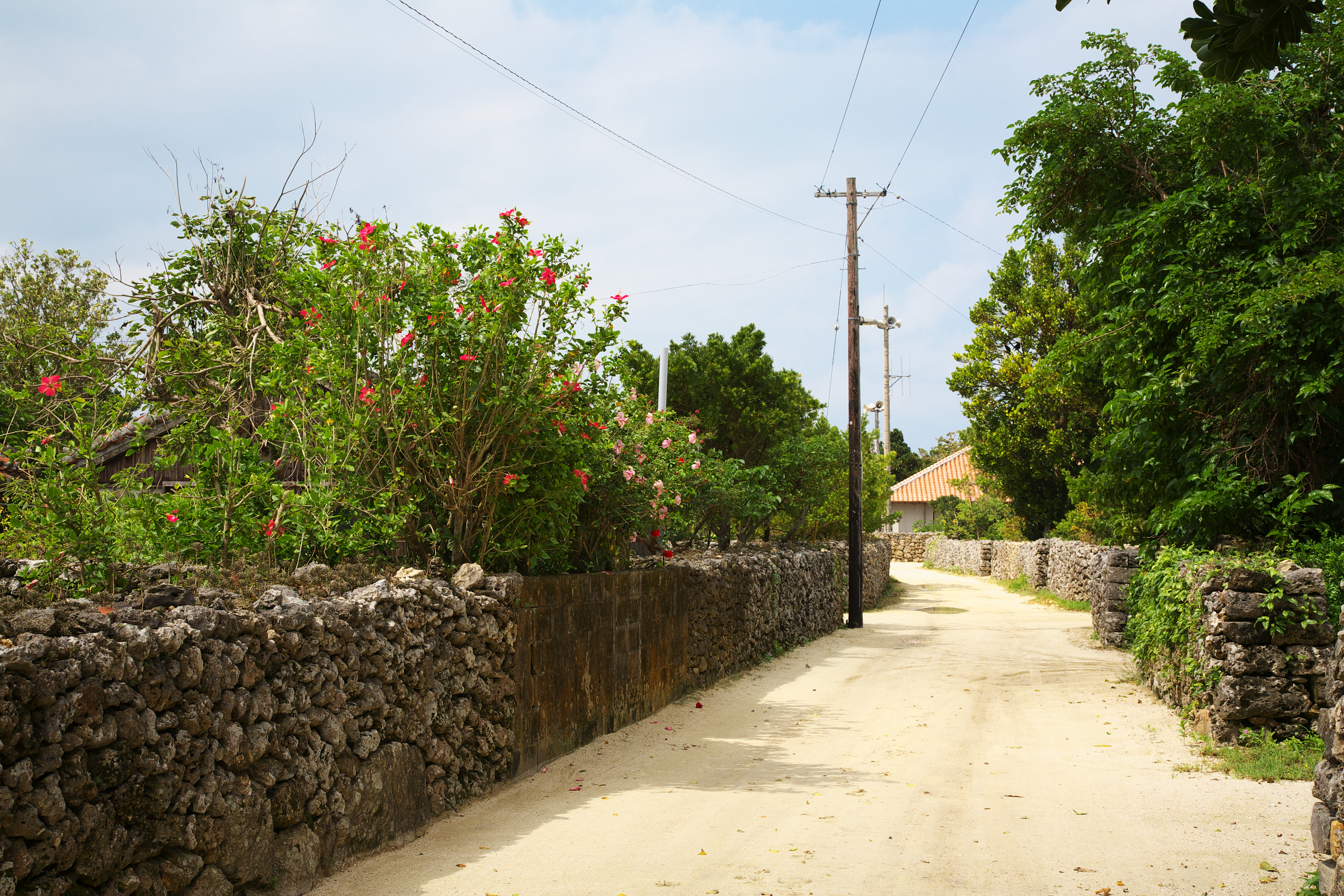 由布島の小道です。ハイビスカスが沖縄ムードを演出しています。