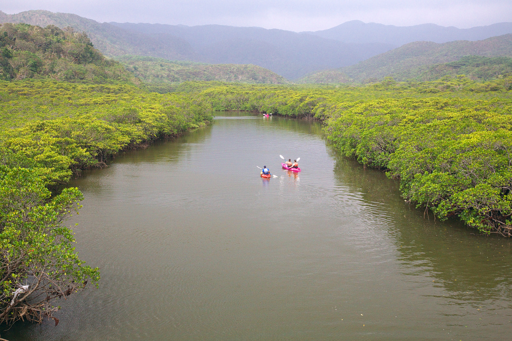 一面のマングローブの林の中、カヌーに乗って冒険に出かける人がいます。