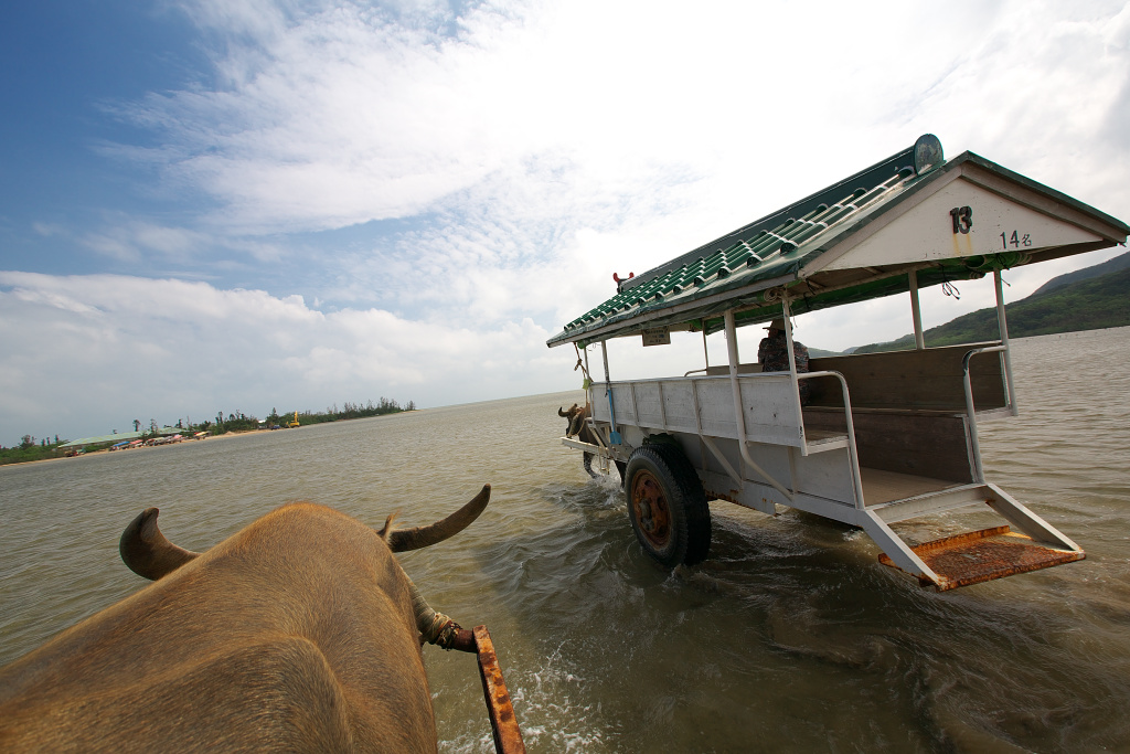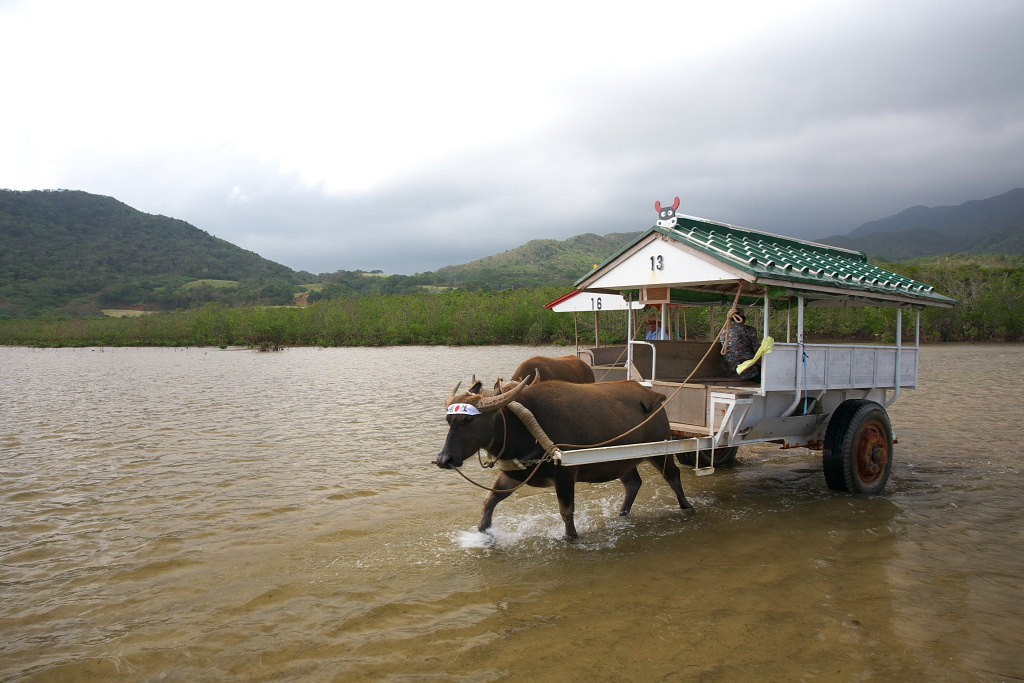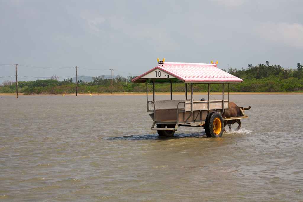由布島から人を乗せて水牛車がやってきました。