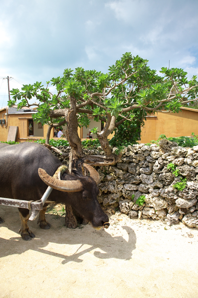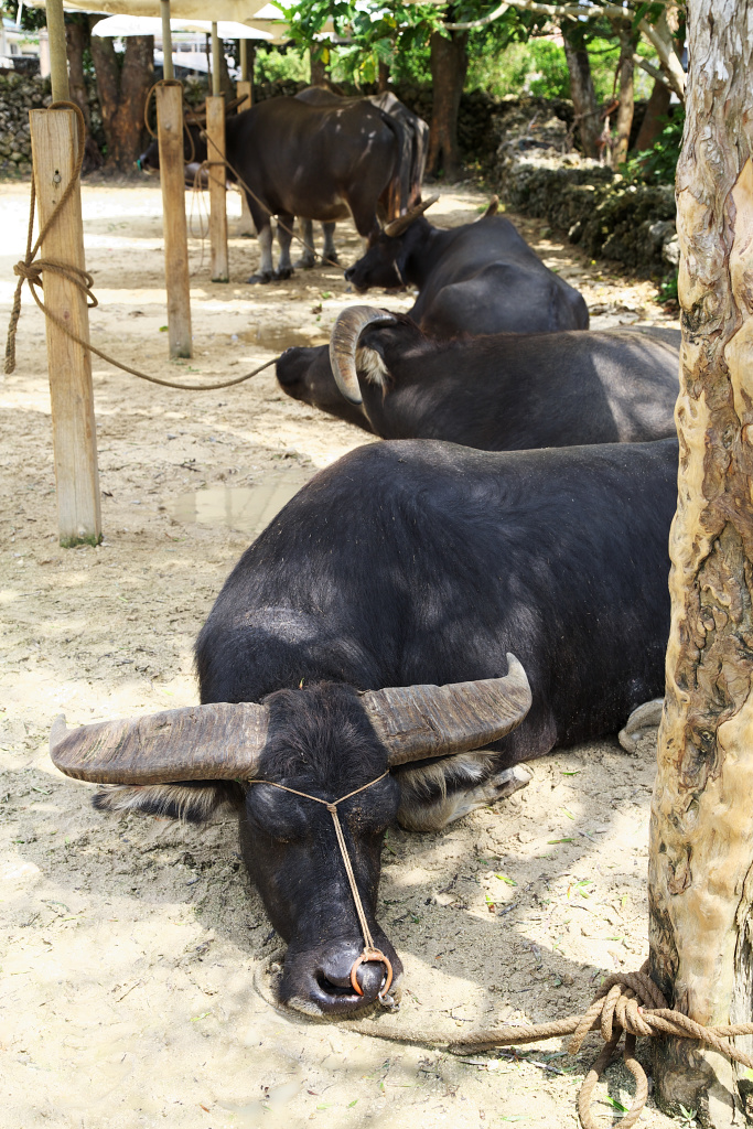 力強く進んでいく牛車の水牛です。この水牛は全て一組の夫婦から生まれた一族が、代々この仕事を担当しています。由布島の大切な水牛一家です。