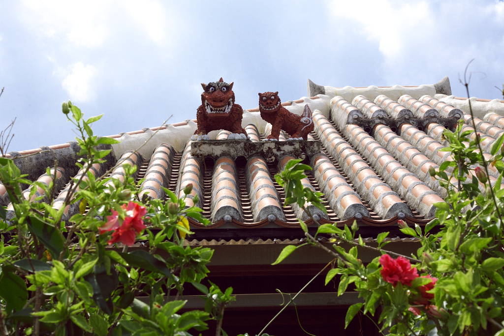 屋根の上でにたにた笑いを浮かべるシーサー親子。